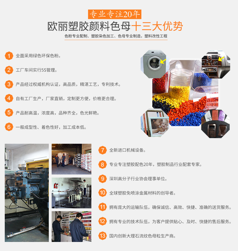 “深圳市歐麗塑膠原材料有限公司”創(chuàng)辦于上世紀(jì)90年代初,經(jīng)過(guò)20多年的不斷發(fā)展壯大,已經(jīng)成為色母粒、色母料、黑色母粒等塑料色母粒領(lǐng)先的色母粒廠(chǎng)家,更是塑膠制品行業(yè)的報(bào)務(wù)精英。